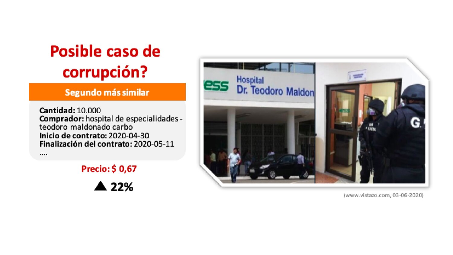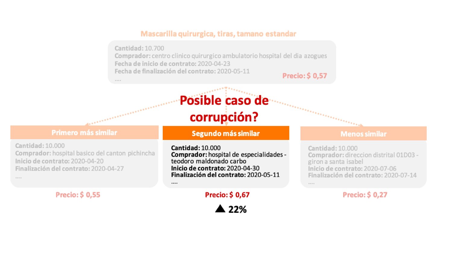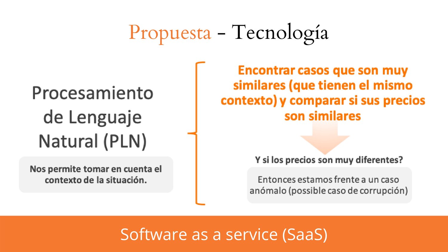 El grupo identificó la dificultad que existe para detectar un caso de corrupción basado solo en el precio y la cantidad de la compra y la necesidad de entender el contexto situacional. Es así que propusieron un producto que use tecnologías de procesamiento de lenguaje natural, word embeddings y desarrollo en python que procesará los textos, los analizará y realizará contraste con otros casos similares para así detectar los casos de corrupción.