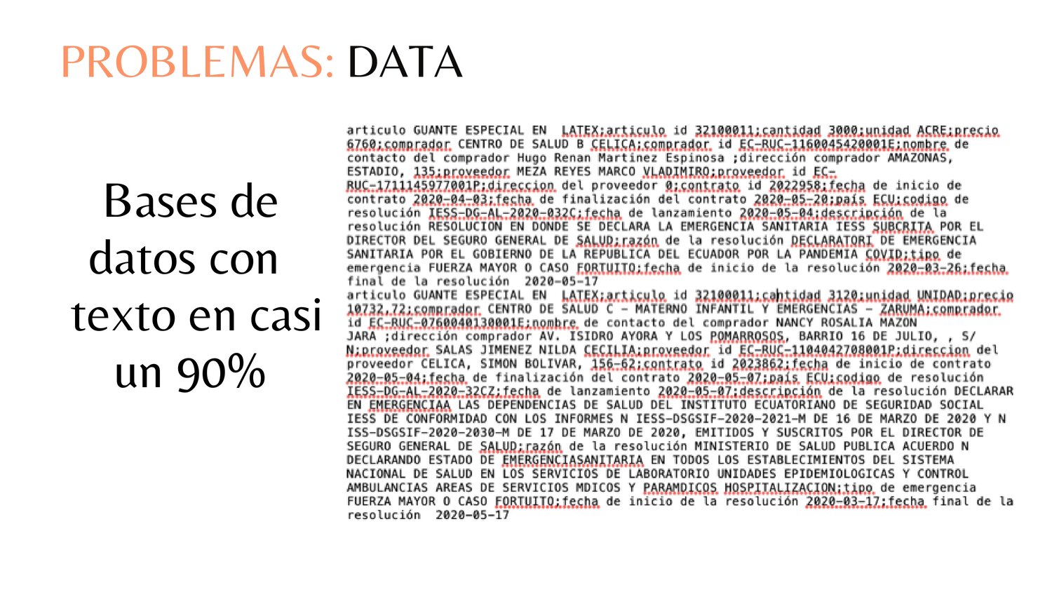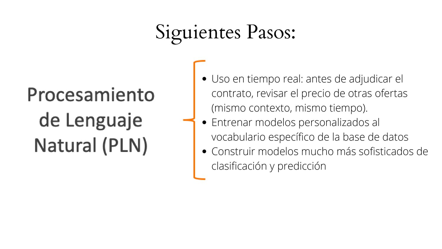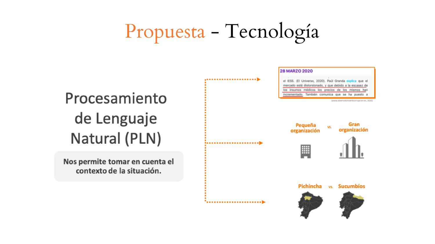 El grupo identificó la dificultad que existe para detectar un caso de corrupción basado solo en el precio y la cantidad de la compra y la necesidad de entender el contexto situacional. Es así que propusieron un producto que use tecnologías de procesamiento de lenguaje natural, word embeddings y desarrollo en python que procesará los textos, los analizará y realizará contraste con otros casos similares para así detectar los casos de corrupción.