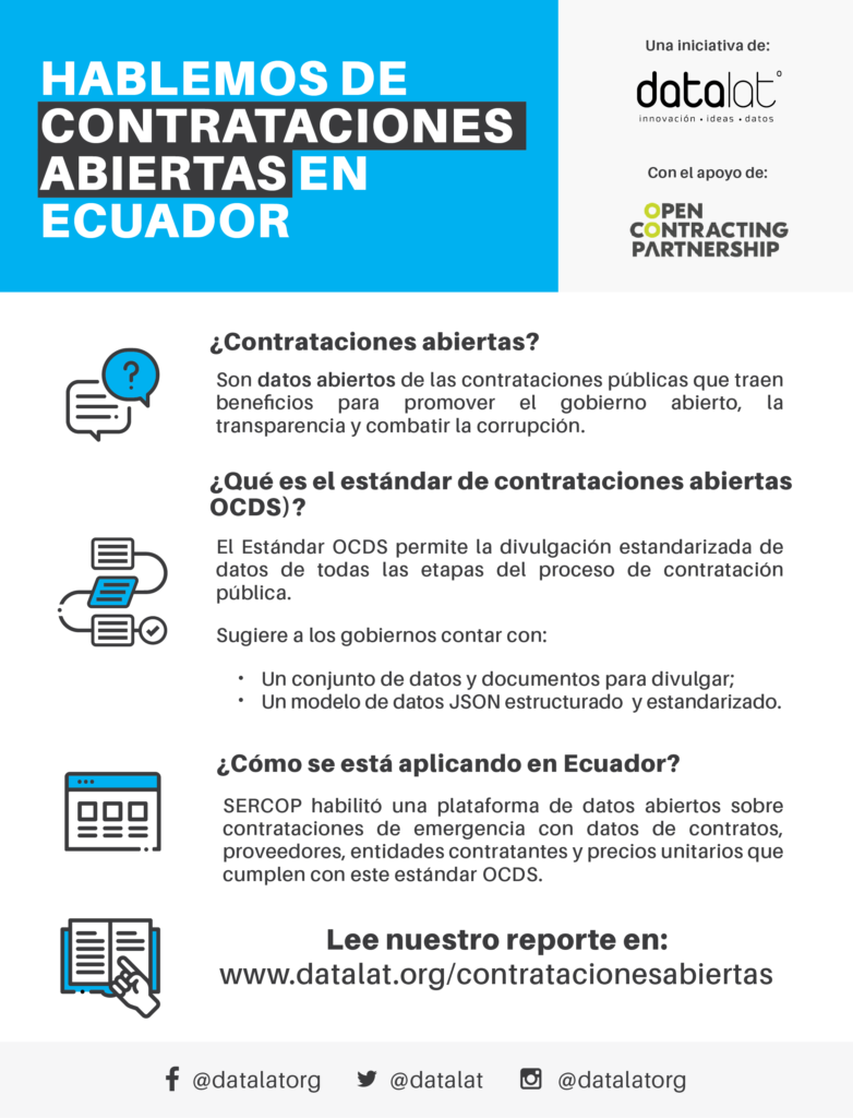 En el caso de Ecuador, el 16 de marzo de 2020, tras la declaración nacional de la Emergencia Sanitaria Nacional por coronavirus COVID-19, el SERCOP, entidad a cargo del sistema de contratación pública, puso en marcha procedimientos de contratación pública en cumplimiento del estado de emergencia mediante la emisión de documentación oficial con base en la Ley Orgánica del Sistema Oficial de Contratación Pública (SOCE). En el mes de mayo SERCOP lanzó el portal de datos abiertos de las contrataciones públicas en emergencia y a partir del 9 de junio ya contaba con los lineamientos del Estándar de Datos de Contratación Abierta, que es un producto central de la Open Contracting Partnership (OCP).