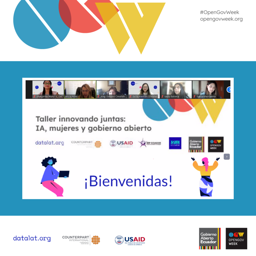 En este sentido, el Taller innovando juntas, IA, mujeres y gobierno abierto surgió como un espacio que brinda la oportunidad para reflexionar sobre el uso responsable de las tecnologías emergentes, así como los marcos éticos al momento de adaptar o elegir estas herramientas para mejorar la gestión pública, social o privada; y fortalecer la participación de mujeres en Gobierno Abierto como parte de los eventos de la semana de Gobierno Abierto 2023 (Open Gov Week 2023).